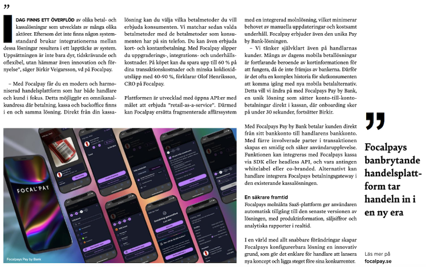 Excerpt from interview: “For the last 40 years, card payment has been the practice in the market, but since the card was introduced, the technology has not been significantly updated. For merchants, this is an expensive and energy-intensive way to get paid, and as the industry’s demands become more complex, the need for new, consolidated solutions has increased. To meet the need for new solutions, system supplier Focalpay has launched the world's first combined payment, checkout and backoffice platform. A solution that enables merchants to easily switch to a modern and harmonized ecosystem, and improve the customer experience, lower costs, reduce carbon dioxide emissions and increase operational reliability.”